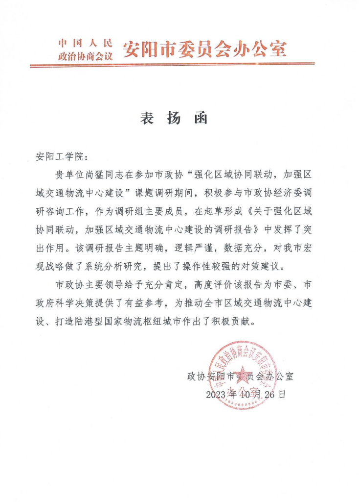 近日,公司收到政协安阳市委员会发来的表扬函,表扬公司教师尚猛同志在市政协“强化区域协同联动,加强区域交通物流中心建设”课题调研期间的突出贡献。