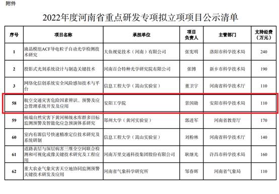 根据2022年8月4日河南省科技厅的《2022年度河南省重点研发专项拟立项公示》,公司作为主体申报的“航空交通灾害危险因素辨识、预警及应急管理系统开发及应用”项目获2022年度河南省重点研发专项立项,立项金额110万元。公司在科研项目申报方面获得了新突破。
