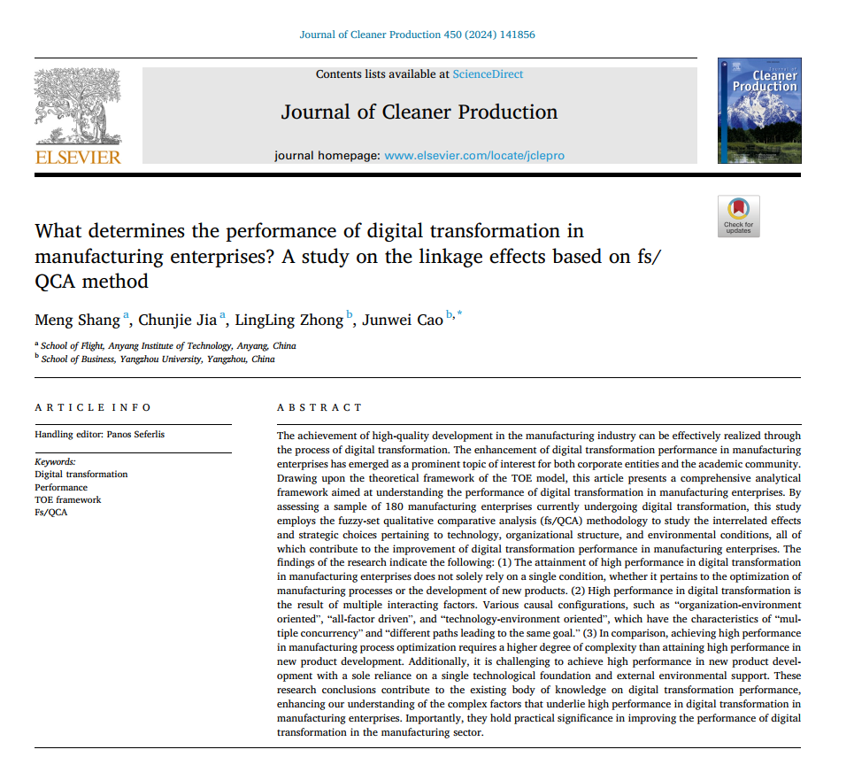 近日,公司教师尚猛、贾纯洁的研究成果《What determines the performance of digital transformation in manufacturing enterprises?》在管理科学与工程领域权威期刊《Journal of Cleaner Production》(中科院SCI&SSCI双检索一区 Top期刊,IF:11.1)上发表。该论文为公司与扬州大学合作发表,公司为第一单位,尚猛为论文第一作者。该项目获得河南省软科学项目支持。