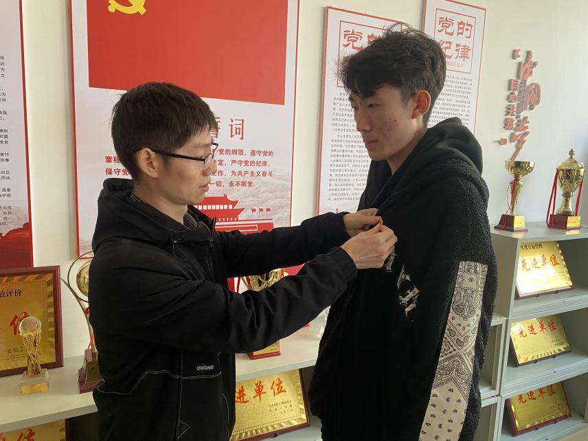 员工第二党支部书记雷杰为员工党员佩戴党员徽章
